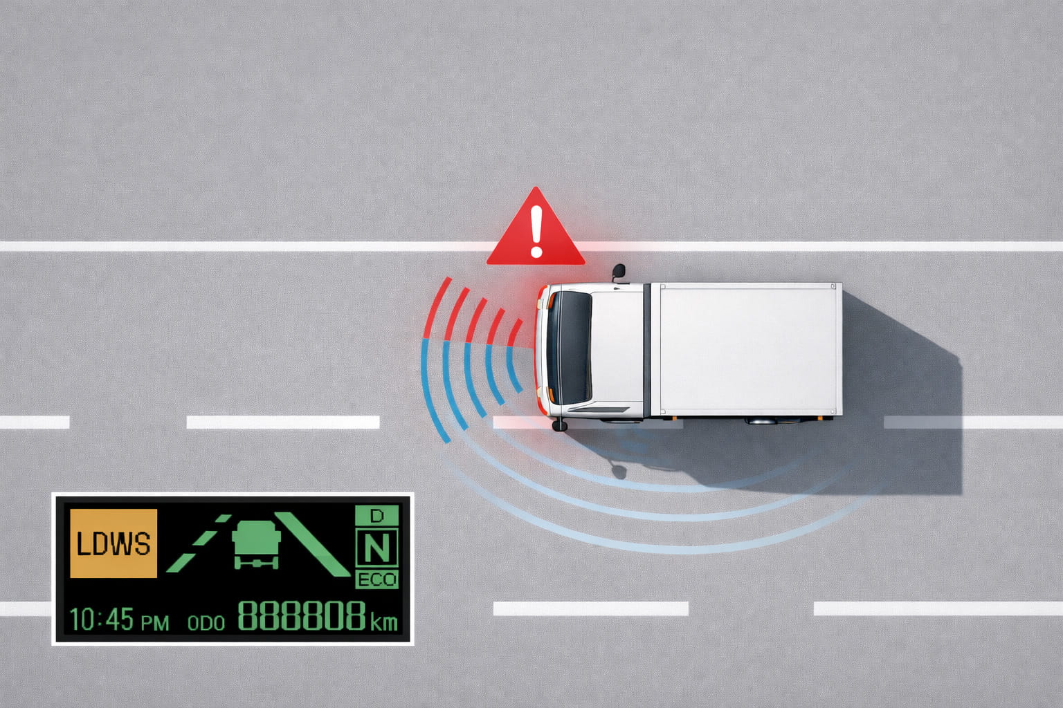走行中に車両が車線から外れそうになるとカメラで検知し、警報音や表示でドライバーに注意を促して、はみ出し事故を防ぐ安全支援機能です。